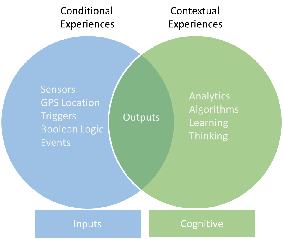 I’ve been blogging recently on the CSC Technology Perspectives blog about contextual experiences and how they will begin to dominate how work is performed. There is a difference in my mind between contextual experiences and logic based conditional experiences. Contextual in my view uses some form of intelligence to predict what is needed and builds and experience. Conditional uses factual logic based analysis to deliver experiences. Both contextual and conditional are increasingly important; especially given the rise of things capable of driving conditional experiences. Conditional experiences are absolutely available today for smart workers who are beginning their digital journey; but the power of both combined will be how individuals and enterprises will differentiate themselves.